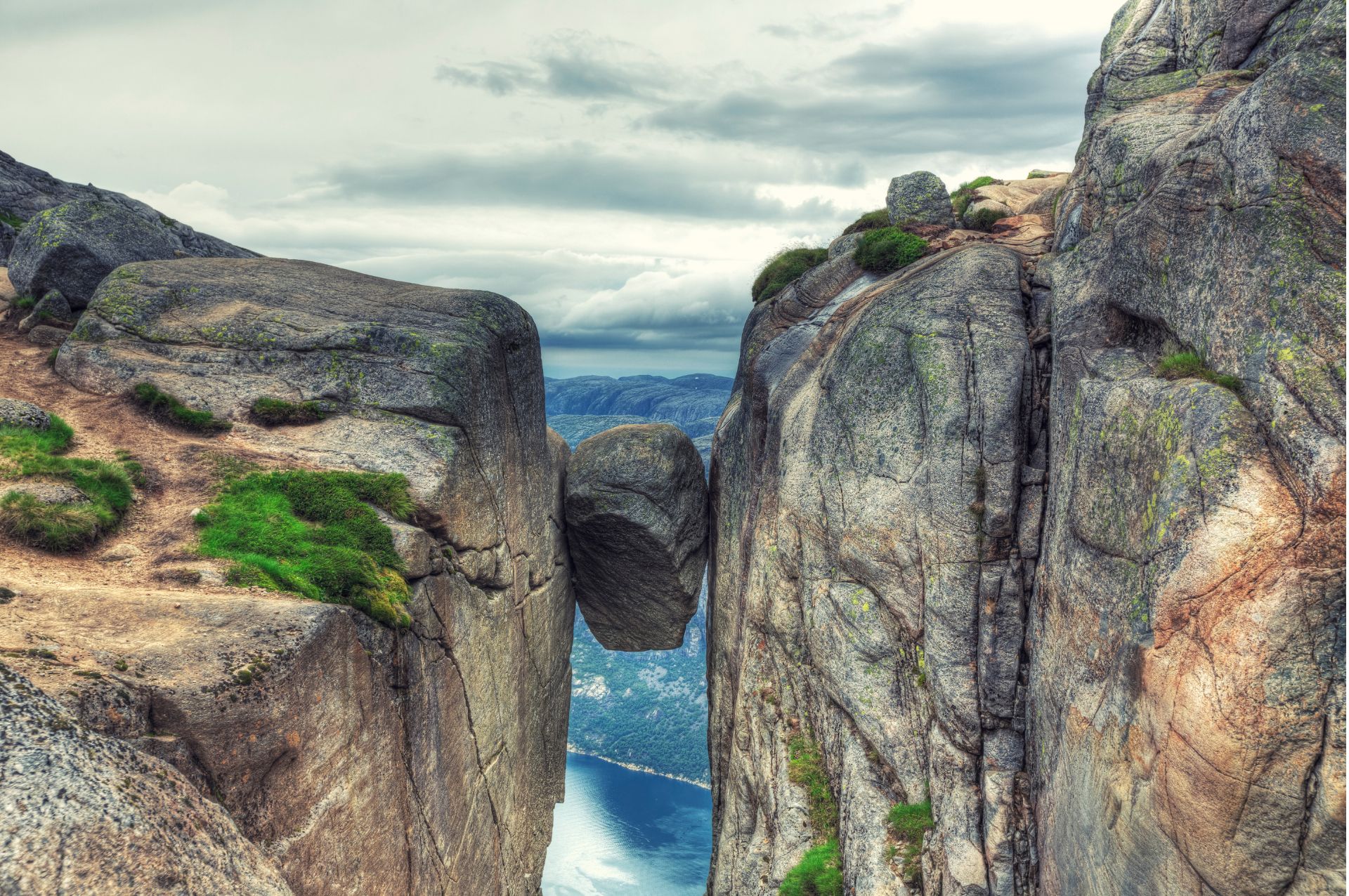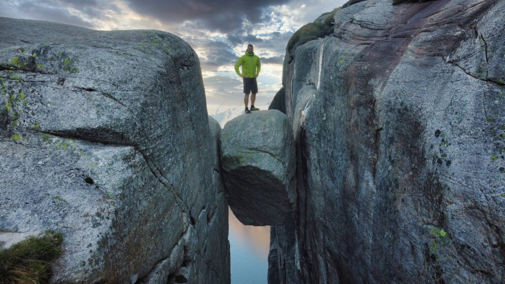 At the Kjerag plateau, the cliamax for the trip is to take a photo on top of the “Kjeragbolten”. This rock is wedged solid in mountain crevice. It’s not big, it’s 1000 meters down to the underground. So many let this oportunity go.